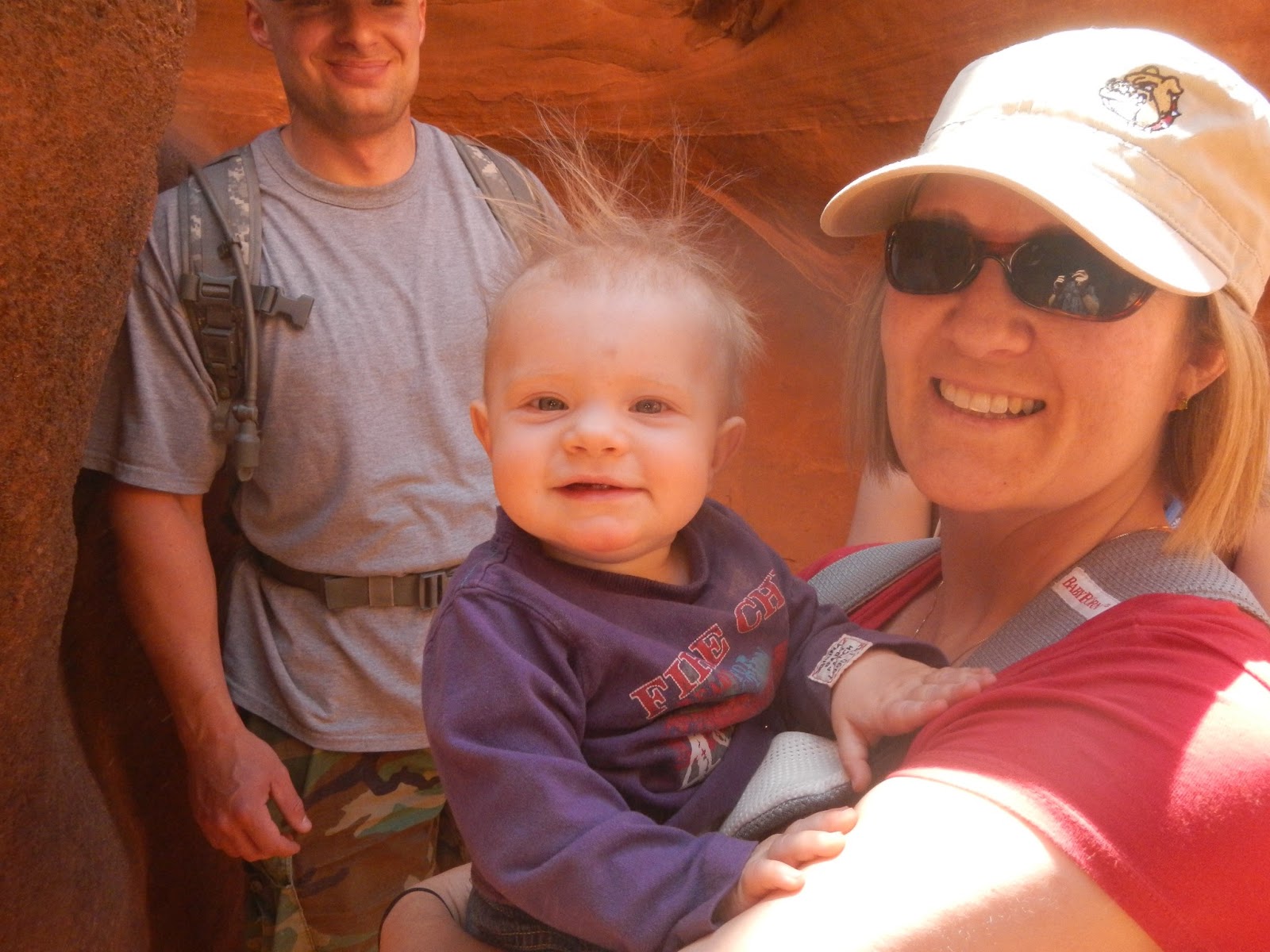 When we reached the mouth of the first slot canyon, Peek-a-boo, I became very reticent about proceeding with a dog and a baby strapped to Cristal's belly. We were insightful enough to bring the belly carrier as opposed to the baby backpack; it was a good thing too, we never would have fit through some of the slots with the baby backpack.